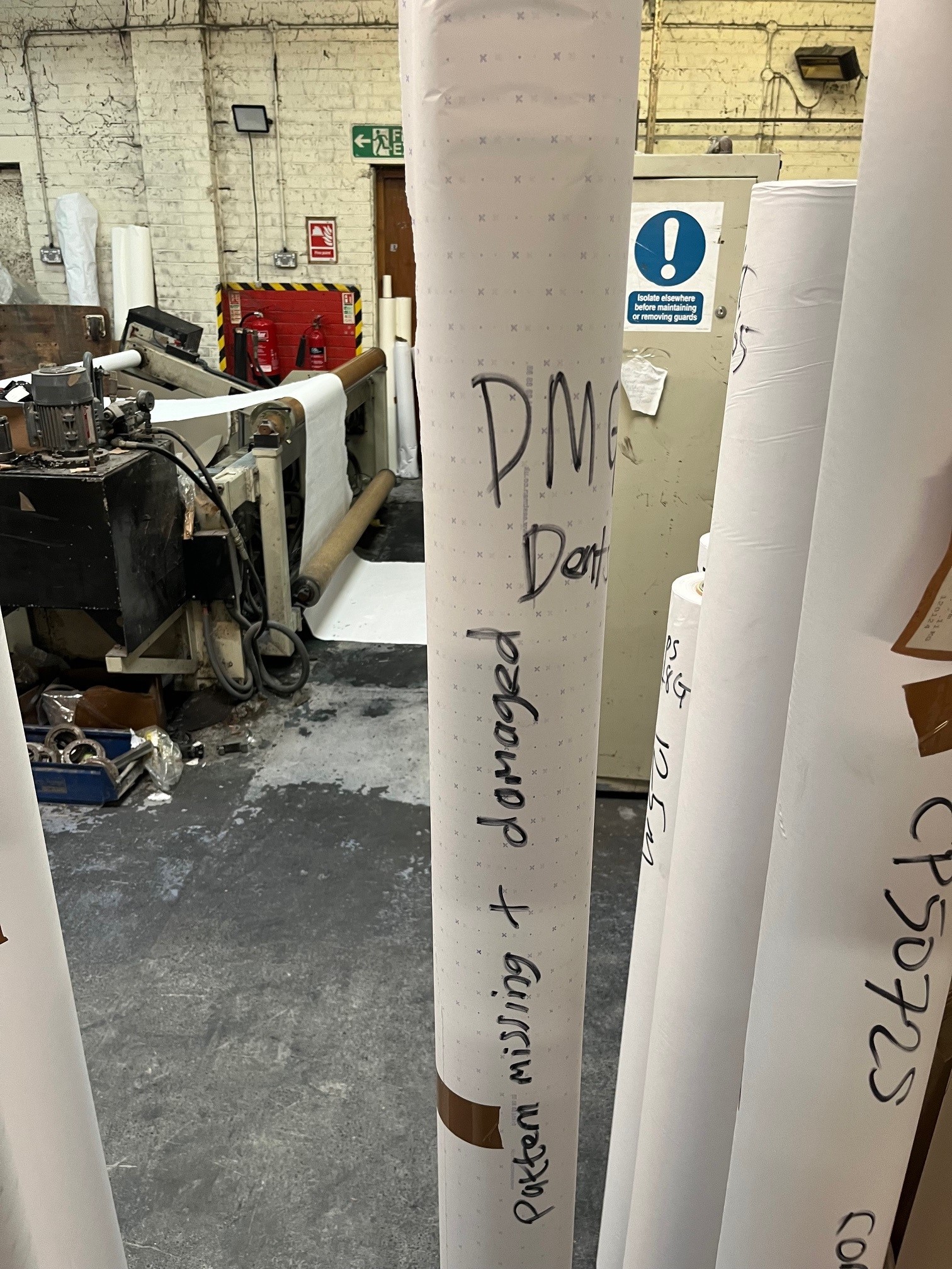 SIDE DENTED AND HALF PATTERNED (PATTERN INCONSISTANCIES THROUGHOUT THE ROLL)
